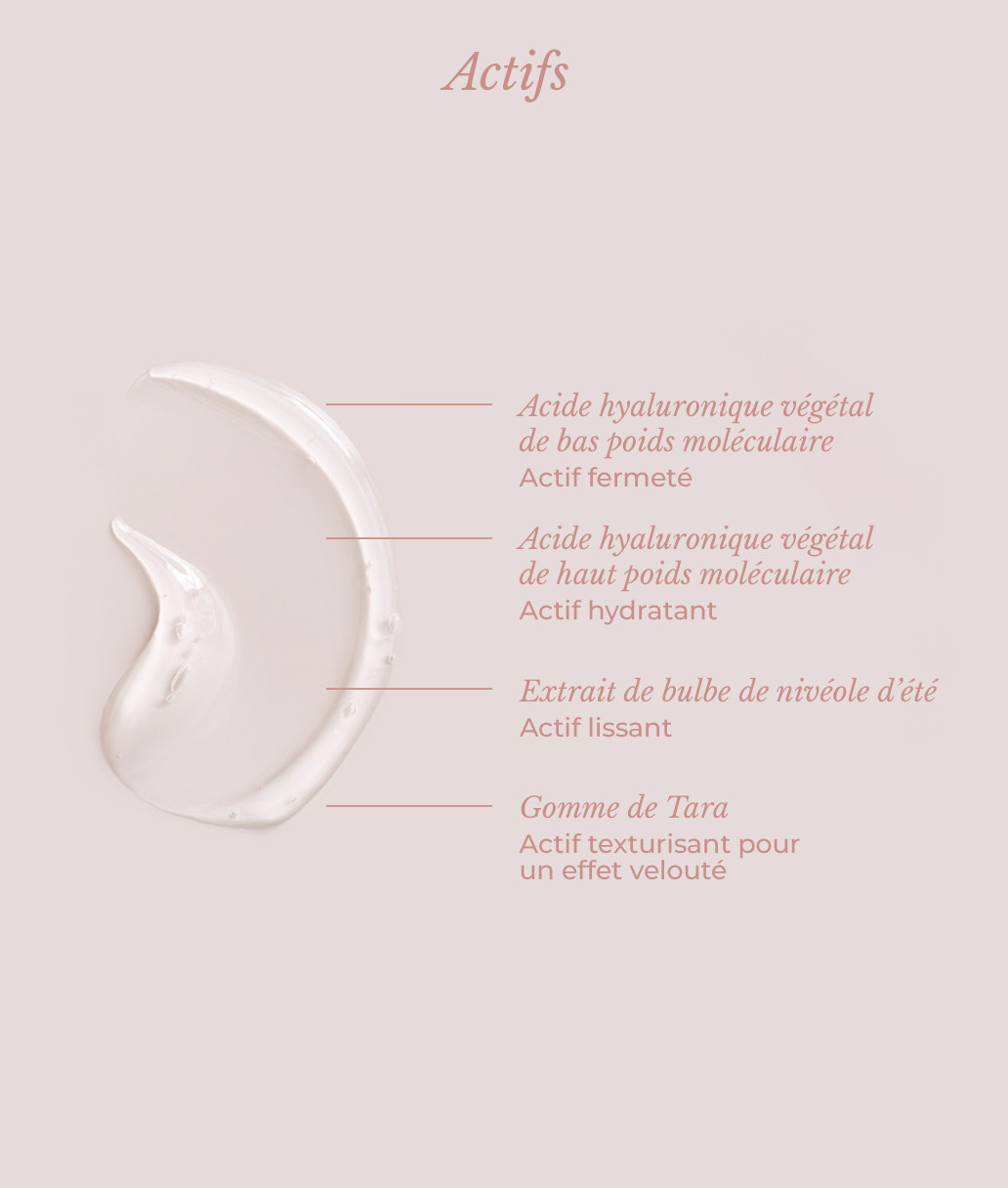 - Extrait de bulbe de nivéole d'été : Cet extrait contribue à réduire les ridules et les rides d’expression, causées par les mouvements de la peau liés aux contractions des muscles du visage.